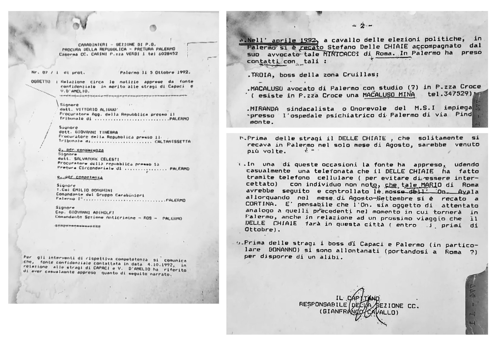 “In sede di contatti informali con inquirenti impegnati nelle indagini inerenti alle recenti note stragi perpetrate in questo territorio, si è appreso in via ufficiosa che la locale Polizia di Stato avrebbe acquisito significativi elementi informativi in merito all’autobomba parcheggiata in via D’Amelio”. SEGUE
