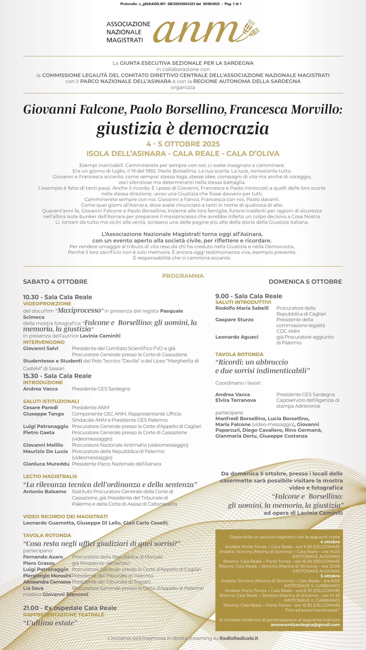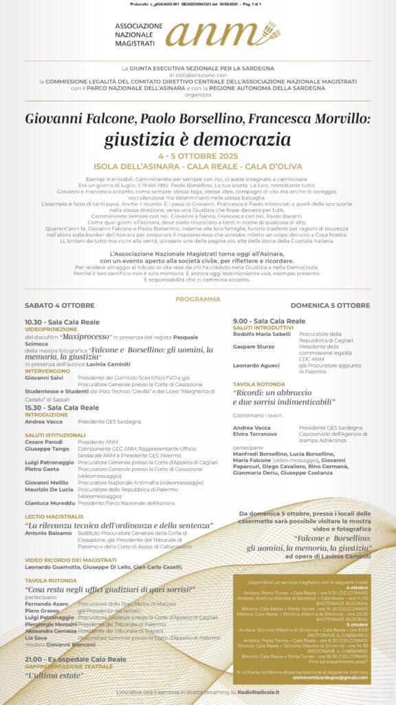 Per Anm saranno presenti il segretario generale Rocco Maruotti, il componente della Giunta Giuseppe Tango e il presidente della commissione Legalità Gaspare Sturzo. Tra gli ospiti il procuratore generale di Cagliari Luigi Patronaggio; Il procuratore di Cagliari Rodolfo Sabelli; Lia Sava, procuratore generale presso la Corte d’Appello di Palermo; Fernando Asaro, procuratore della Repubblica a Marsala e Antonio Balsamo, sostituto procuratore generale della Corte di cassazione. Ci saranno i videomessaggi del procuratore generale della Cassazione Pietro Gaeta, del procuratore nazionale Antimafia Giovanni Melillo, del procuratore della Repubblica di Palermo Maurizio De Lucia e del presidente del Tribunale di Palermo Piergiorgio Morosini. Per raccontare l’atmosfera di quegli anni anche il video ricordo degli ex magistrati Leonardo Guarnotta, Giuseppe Di Lello e Gian Carlo Caselli Per l’occasione la compagnia di navigazione Ensamar eseguirà una coppia di corse speciali per l’Asinara nella giornata di sabato 4 ottobre con partenza da Porto Torres alle 9.30 e partenza dall’isola dell’ Asinara alle 16.30 Quanto alle corse di sabato si tratta di corse aggiuntive perchè dal 1° ottobre subentra l’orario autunnale con corse trisettimanali il martedì, venerdì e la domenica con partenza da Porto Torres alle 8:30 e 15:30 e rientro dall’Asinara alle 10:00 – 17:00