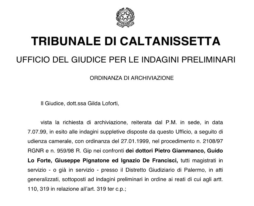 Luglio 1999 – Ordinanza di archiviazione Giammanco, Lo Forte, Pignatone, De Francisi SEGUE