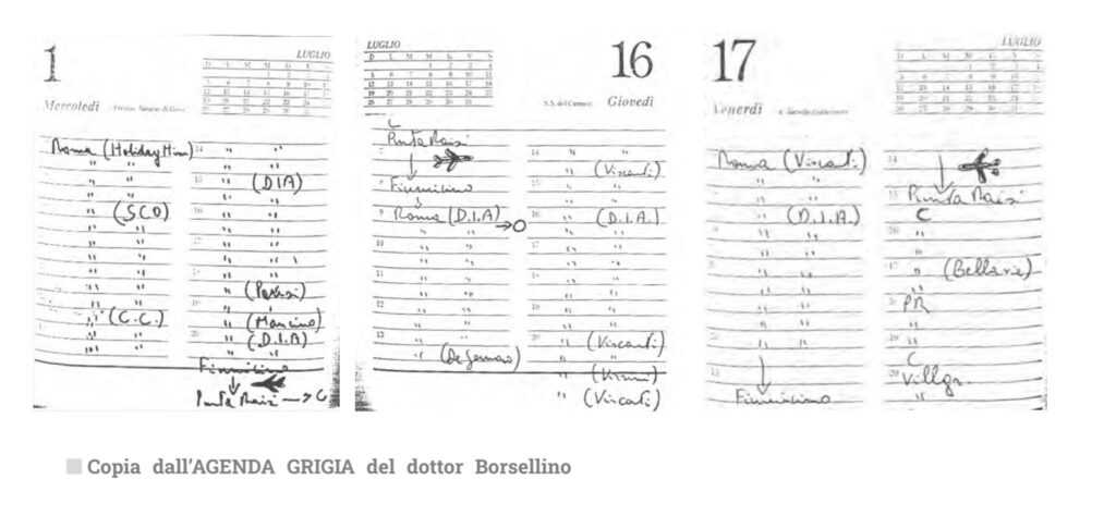 16 e 17 luglio 1992 BORSELLINO si reca a Roma per interrogare il pentito GASPARE MUTOLO ed altri collaboratori. L’interrogatorio dura parecchie ore. Il pentito accetta di verbalizzare le accuse su Contrada e Signorino. Ma non si fa in tempo, se ne riparlerá lunedí prossimo. É tardi. Borsellino chiude il verbale senza neppure una parola, sempre piú incupito. Saluta Mutolo, ed é l´ultima volta che lo vede.Un confidente dei carabinieri di Milano rivela che si sta preparando un attentato ad Antonio Di Pietro e a Paolo Borsellino. La fonte è ritenuta altamente attendibile ed il raggruppamento ROS di Milano invia un rapporto alla Procura di Milano ed a quella di Palermo. L’informativa è inviata per posta ordinaria ed arriverà a Palermo dopo la strage di Via D’Amelio. In seguito a questa notizia viene pesantemente rafforzata la scorta a Di Pietro ed alla sua famiglia, il PM milanese non dorme neppure a casa sua. Il maresciallo Cava del ROS di Milano tenta anche di mettersi in contatto diretto con la Procura palermitana ma senza risultato.