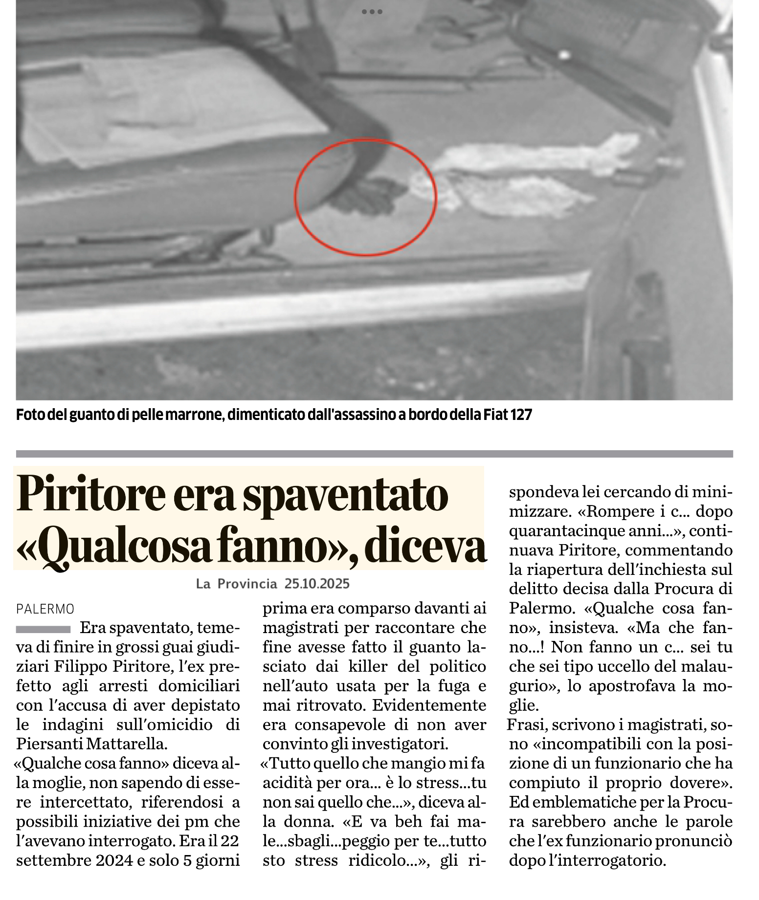 Al centro dell’accusa a Piritore c’è un guanto: è quello che venne trovato nella macchina usata dagli assassini nell’attacco a Mattarella e ritenuto da sempre una prova centrale nelle indagini, anche perché fu una delle pochissime a disposizione. Oggi grazie ai nuovi metodi sull’analisi del DNA il guanto potrebbe essere decisivo per individuare i responsabili dell’omicidio, ma è stato perso (non è nemmeno chiaro quando di preciso). Il guanto in questione si vede in una fotografia che fu scattata all’epoca all’auto usata dagli esecutori dell’omicidio. Nella sua testimonianza del 2024 Piritore spiegò che fu lui a prendere in carico il guanto dopo il ritrovamento e descrisse i vari passaggi che fece in quei giorni, prima che venisse perso. Disse di averlo dato a un poliziotto della scientifica affinché lo desse al sostituto procuratore Pietro Grasso (l’ex presidente del Senato e politico noto), come aveva scritto in una relazione dell’epoca: sia il poliziotto che Grasso smentirono questa versione e dissero di non aver mai avuto il guanto (il poliziotto peraltro era in malattia). Poi Piritore disse di averlo dato a un altro poliziotto, un tale Lauricella, ma non risulta nessuno con quel cognome che abbia lavorato nella polizia scientifica.