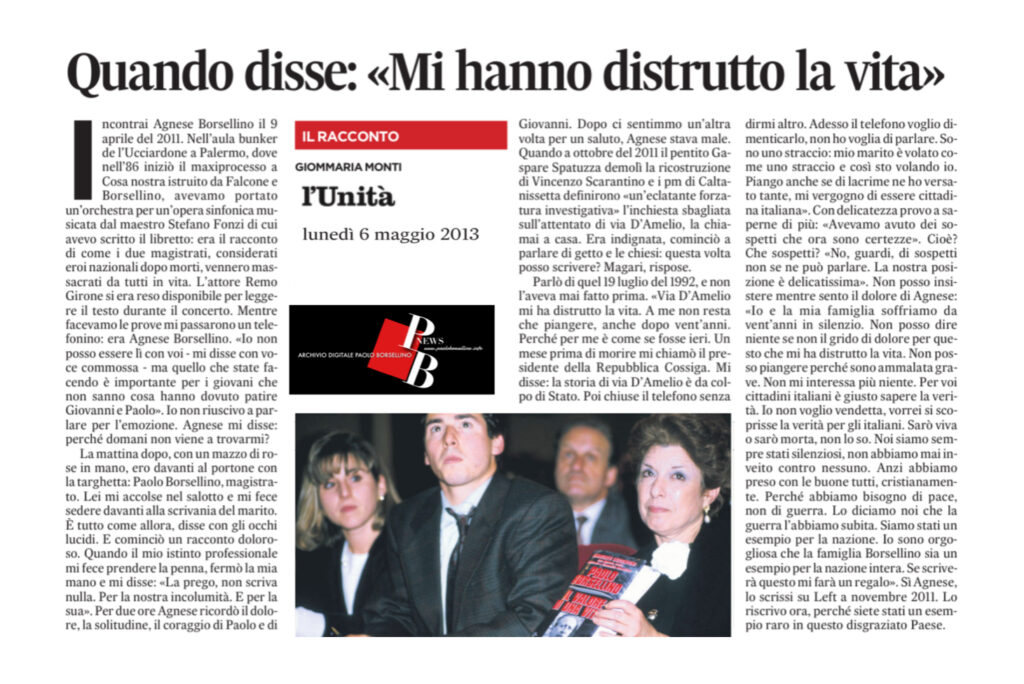 No, guardi, di sospetti non se ne può parlare. La nostra posizione è delicatissima. La storia di via D’Amelio mi ha distrutto la vita e io sono tra la vita e la morte. Questo è bene che sappiano le persone. Perché non sono una vedova come le altre, che si sono ricostruite bene o male una vita. Io ci soffro da venti anni e in silenzio. Io e tutta la mia famiglia. Non posso dire nient’altro se non il grido di dolore per questo che mi ha distrutto la vita letteralmente. La mia vita è finita e lo sanno molte persone. Non devo avere emozioni e non posso piangere perché sono ammalata grave. E invece piango perché tutte queste notizie mi fanno piangere. E piango come il primo giorno. Questa è la storia. E via D’Amelio non solo ha distrutto l’immagine dell’Italia. Ha distrutto la mia vita. E questo per me è molto più importante. Non mi interessa più niente. Letteralmente. Verità, non verità. Sì, va bene, per voi cittadini italiani è giusto che si sappia la verità. Io non ho vendetta. Non voglio la verità per questo. Vorrei che si scoprisse la verità per gli italiani.
