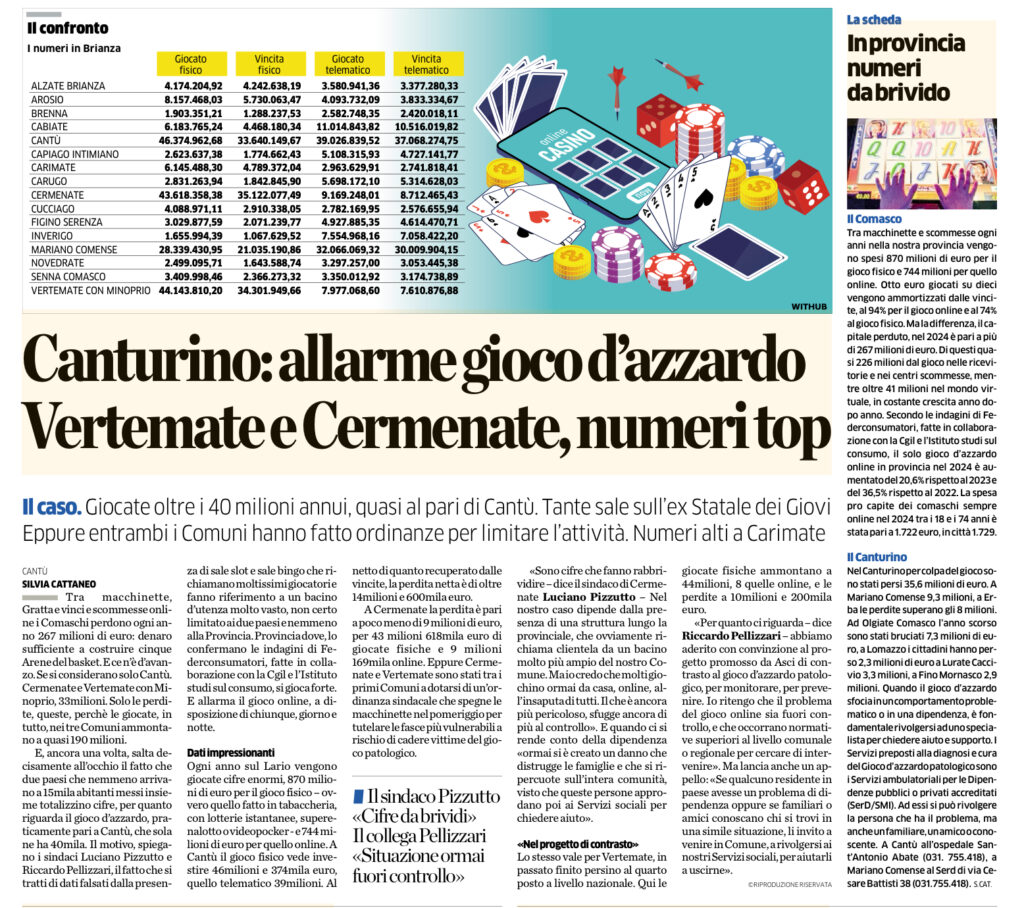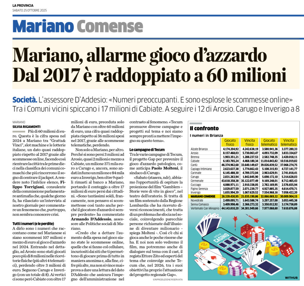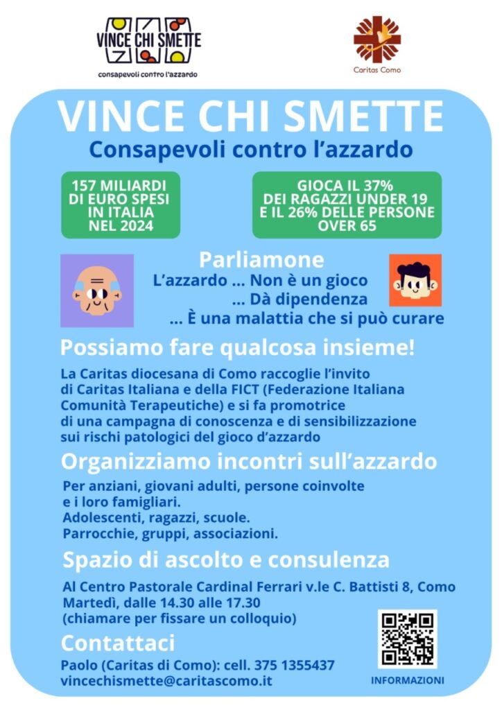 Il progetto mira a costruire una coscienza critica collettiva e a promuovere azioni concrete di contrasto e prevenzione. L’iniziativa è costruita in collaborazione con Fict (Federazione italiana delle comunità terapeutiche). Promosso dalla Caritas diocesana di Como prevede due azioni concrete. L’organizzazione di incontri di informazione e consulenza sull’azzardo rivolti ad anziani, giovani adulti, persone coinvolte e i loro familiari, adolescenti, ragazzi, scuole, parrocchie, gruppi e associazioni. Poi, l’apertura di uno spazio di ascolto e consulenza al Centro pastorale Cardinal Ferrari, in viale Cesare Battisti 8 a Como, ogni martedì dalle 14.30 alle 17.30.