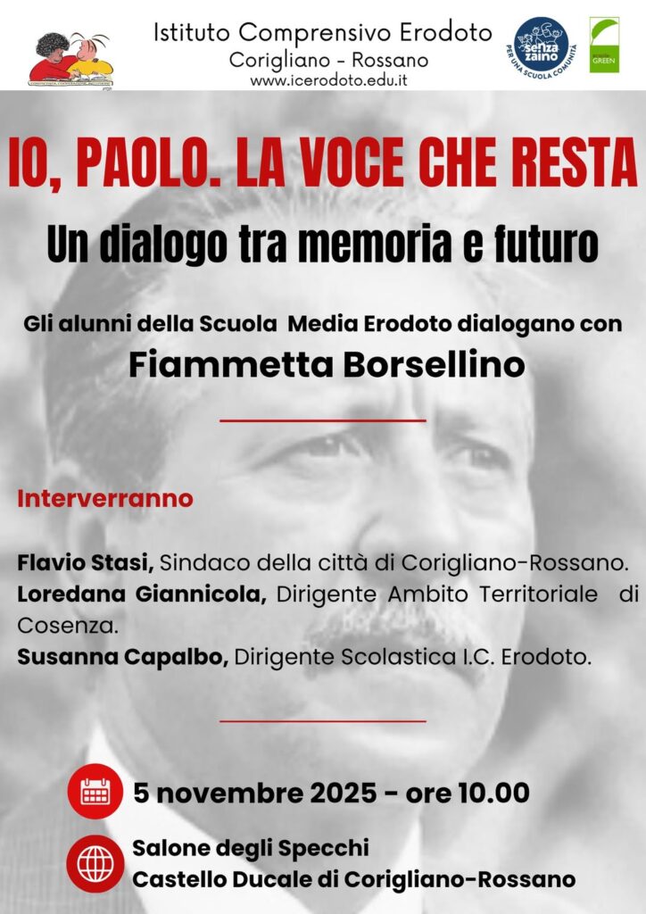 CORIGLIANO-ROSSANO – L’Istituto Comprensivo Erodoto di Corigliano-Rossano promuove un appuntamento di grande valore civile e formativo dal titolo “Io, Paolo. La voce che resta – Un dialogo tra memoria e futuro”, in programma mercoledì 5 novembre 2025 alle ore 10 nel Salone degli Specchi del Castello Ducale.