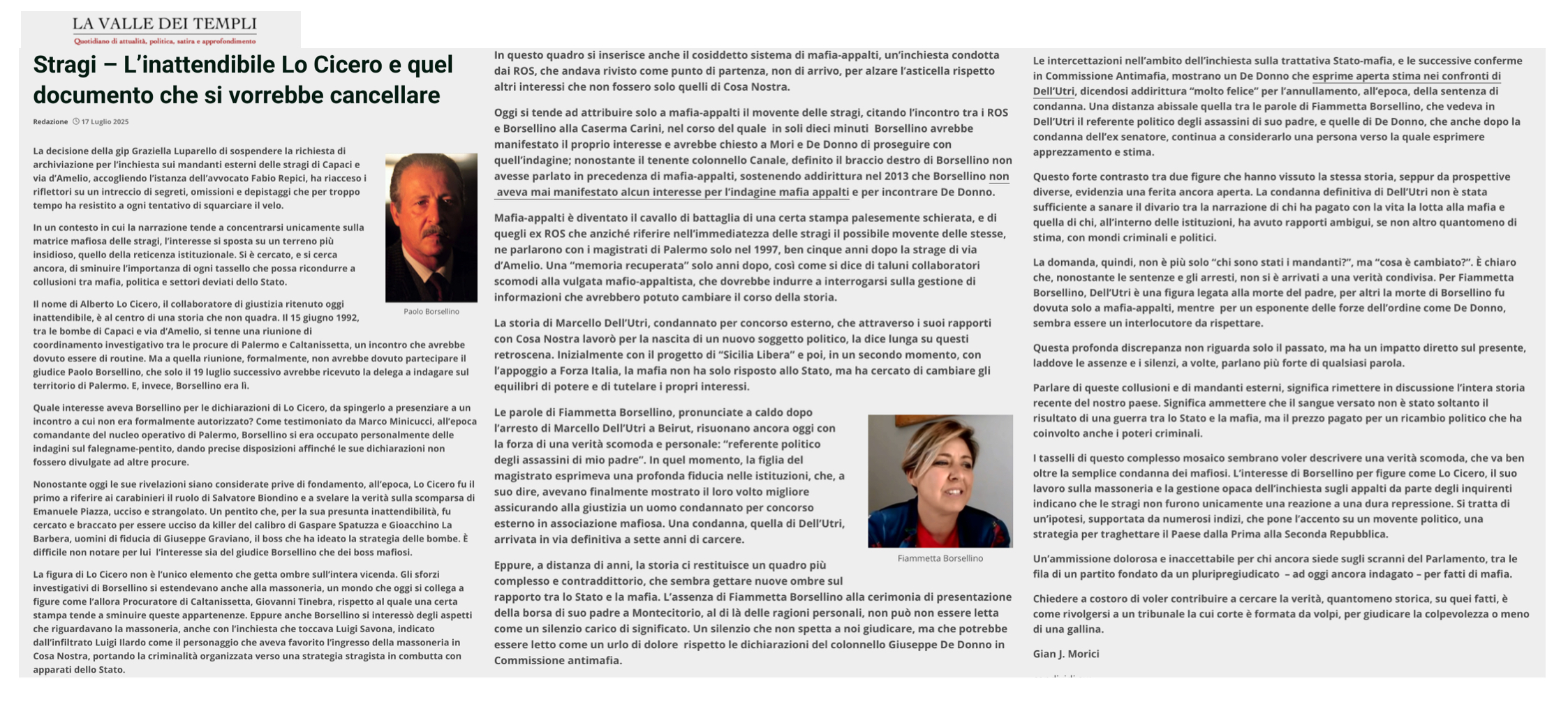 I tasselli di questo complesso mosaico sembrano voler descrivere una verità scomoda, che va ben oltre la semplice condanna dei mafiosi. L’interesse di Borsellino per figure come Lo Cicero, il suo lavoro sulla massoneria e la gestione opaca dell’inchiesta sugli appalti da parte degli inquirenti indicano che le stragi non furono unicamente una reazione a una dura repressione. Si tratta di un’ipotesi, supportata da numerosi indizi, che pone l’accento su un movente politico, una strategia per traghettare il Paese dalla Prima alla Seconda Repubblica. Un’ammissione dolorosa e inaccettabile per chi ancora siede sugli scranni del Parlamento, tra le fila di un partito fondato da un pluripregiudicato  – ad oggi ancora indagato – per fatti di mafia.