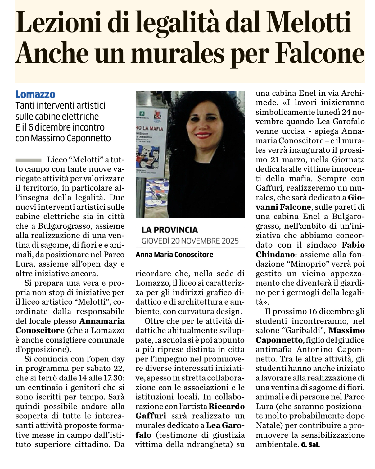 LOMAZZO (CO) Lezioni di legalità con MASSIMO CAPONNETTO e murale dedicato a FALCONE al MELOTTI