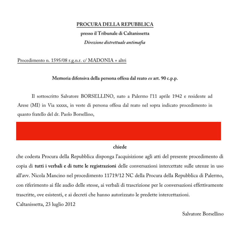 - 23.7.2012 SALVATORE BORSELLINO chiede le intercettazioni al Ministro Mancino – L’istanza