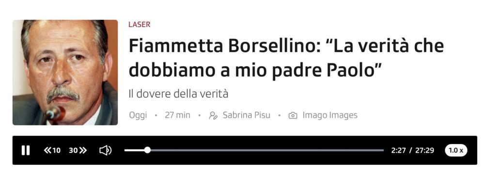 Cinque anni dopo, il 19 luglio del 1992, a Palermo in via D’Amelio una Fiat 126 imbottita di tritolo viene fatta esplodere sotto la casa di sua madre. Muore il magistrato, muoiono gli agenti di scorta Agostino Catalano, Emanuela Loi, Vincenzo Li Muli, Walter Eddie Cosina e Claudio Traina. In questa puntata di Laser incontriamo sua figlia, Fiammetta Borsellino, che è convinta, come il magistrato, che la lotta alla mafia debba partire dai giovani. A loro, in Italia e in Europa, lei racconta la storia di suo padre e la battaglia per la verità sulla strage di via D’Amelio dove c’è stato, secondo i giudici, «il più colossale depistaggio della storia d’Italia».