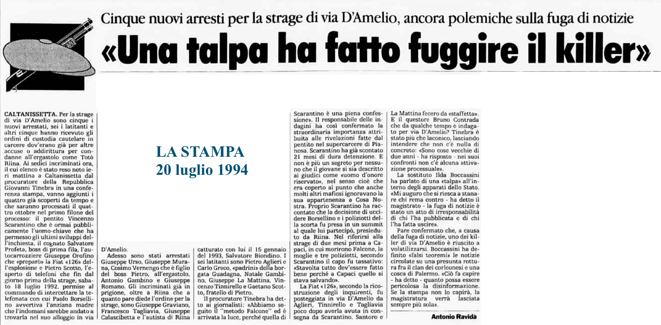 A condurre la conferenza stampa il Procuratore GIOVANNI TINEBRA e la sostituta procuratrice ILDA BOCCASSINI. “Noi oggi qui celebriamo il secondo anniversario dell’eccidio di via d’Amelio ed abbiamo la profonda, commossa, consapevole soddisfazione di celebrarlo nel modo giusto, cioè in maniera fattiva. Ieri infatti abbiamo chiesto ed ottenuto sedici ordinanze di custodia cautelare nei confronti di alcuni dei mandanti e degli esecutori materiali della strage.(…)