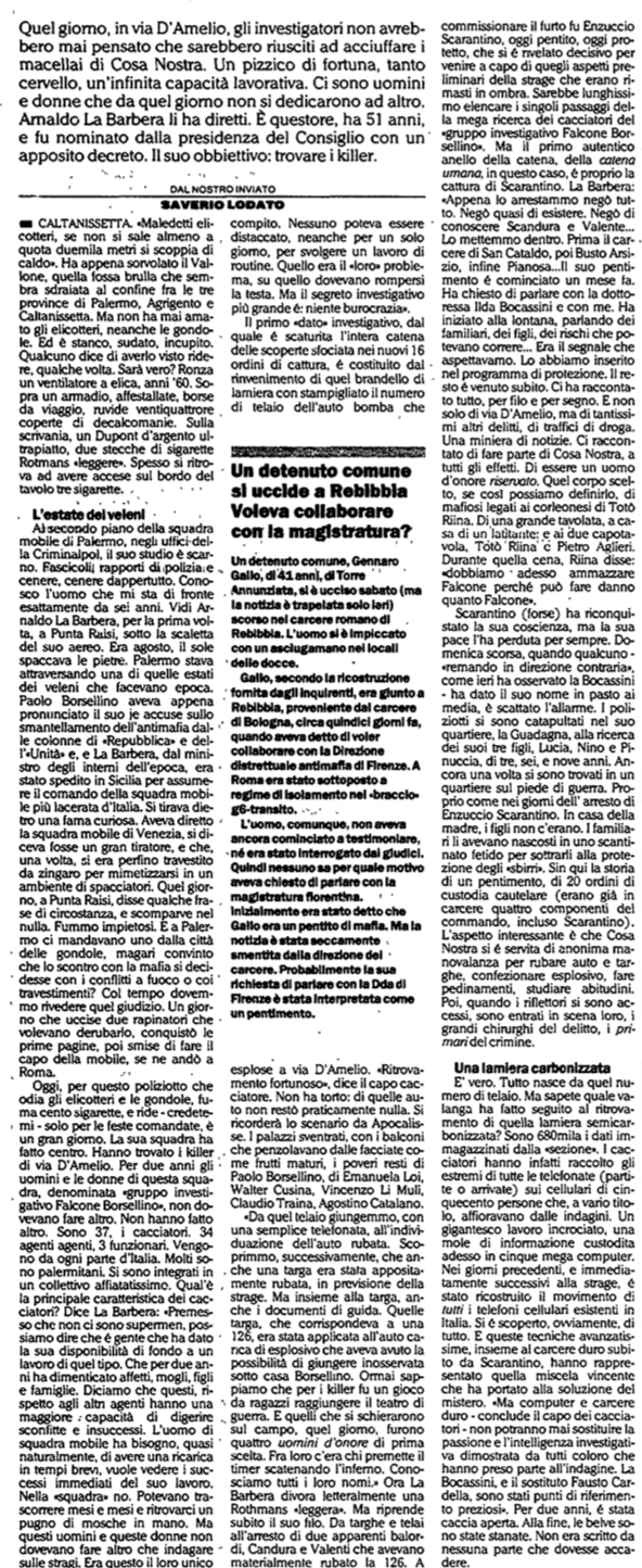 È cominciata da là le indagini sulla strage di via D’Amelio. Mi ricordo che allora la DDA era composta dal dottor Polina, che oggi è Roma, dal dottor Giordano, Petralia e Vaccara, che oggi è (…). E ci mettemmo di buzzo buono a lavorare, con l’aiuto di tutti i pezzi dello Stato.