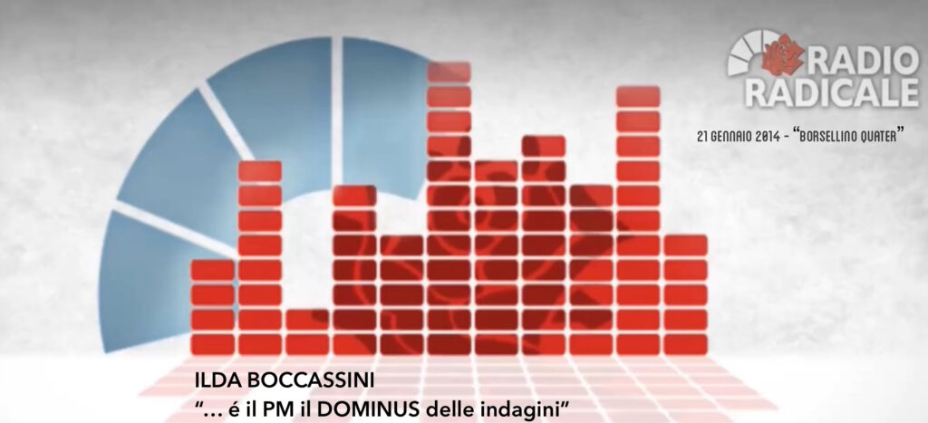 Il 21 gennaio 2014, in occasione della sua deposizione al processo BORSELLINO QUATER. quasi a voler ridimensionare le responsabilità delle forze dell’ordine coinvolte nelle indagini riguardanti le stragi di CAPACI e VIA D’AMELIO, la dottoressa ILDA BOCCASSINI afferma e ribadisce con decisione che “𝗜𝗹 𝗱𝗼𝗺𝗶𝗻𝘂𝘀 𝗱𝗲𝗹𝗹𝗲 𝗶𝗻𝗱𝗮𝗴𝗶𝗻𝗶 è 𝗶𝗹 𝗽𝘂𝗯𝗯𝗹𝗶𝗰𝗼 𝗺𝗶𝗻𝗶𝘀𝘁𝗲𝗿𝗼” e che Carabinieri e poliziotti sono collaboratori.