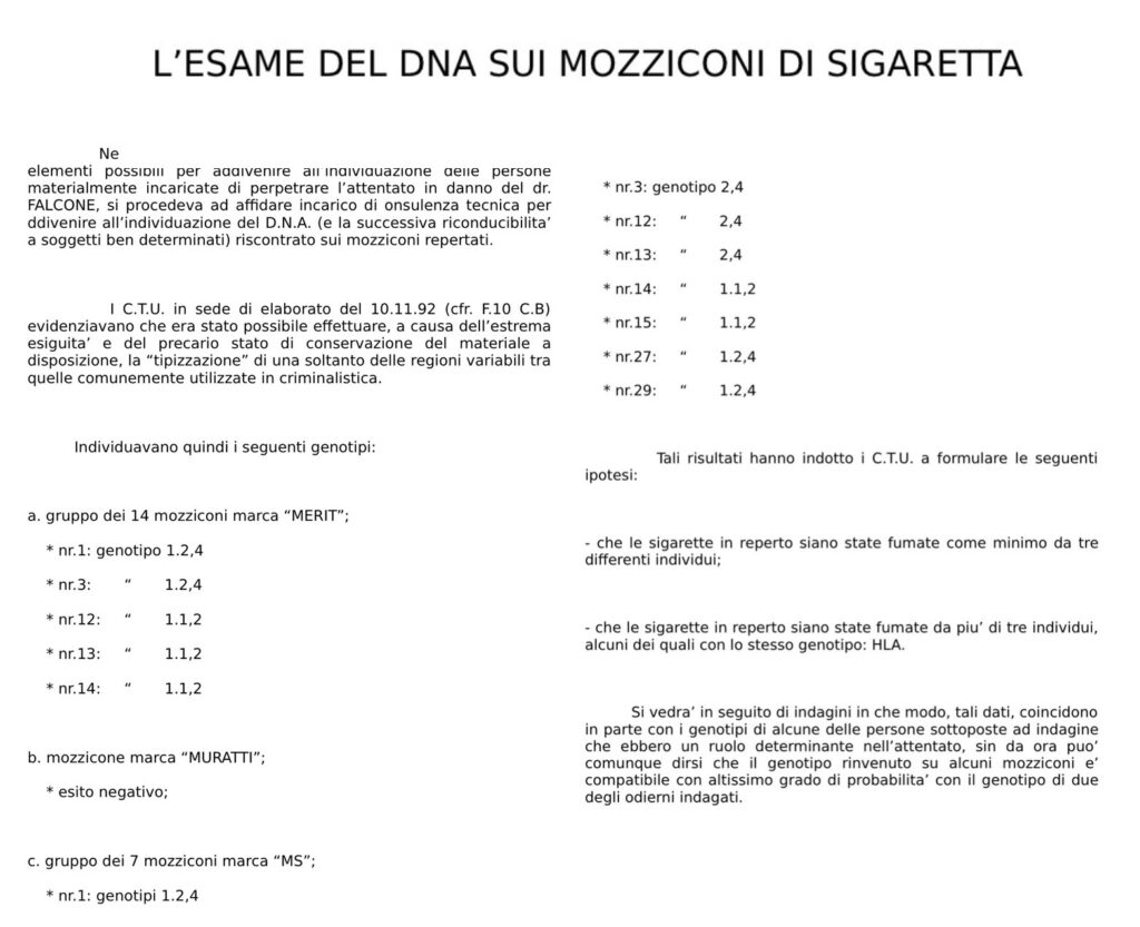 Successivamente in esito ad altro incarico conferito dal Pm i consulenti comparavano i Dna ritrovati con quelli di Di Matteo, La Barbera e Gioè e hanno dichiarato all’udienza del 3-1-96: «In conclusione, abbiamo avuto una attribuzione, una alta compatibilità con il sangue di Di Matteo e La Barbera per i genotipi detti cosi’, riconosciuti internazionalmente 2-4 sui tre mozziconi di marca Merit; questo mentre vi era un’esclusione per quanto riguardava il DNA di Gioe’ Antonino. Quindi avevamo una esclusione ed una attribuzione per il Di Matteo e La Barbera. Questa attribuzione, estimabile in percentuale dell’8,8 persone; cioè un’attribuzione del 91,2% circa».
