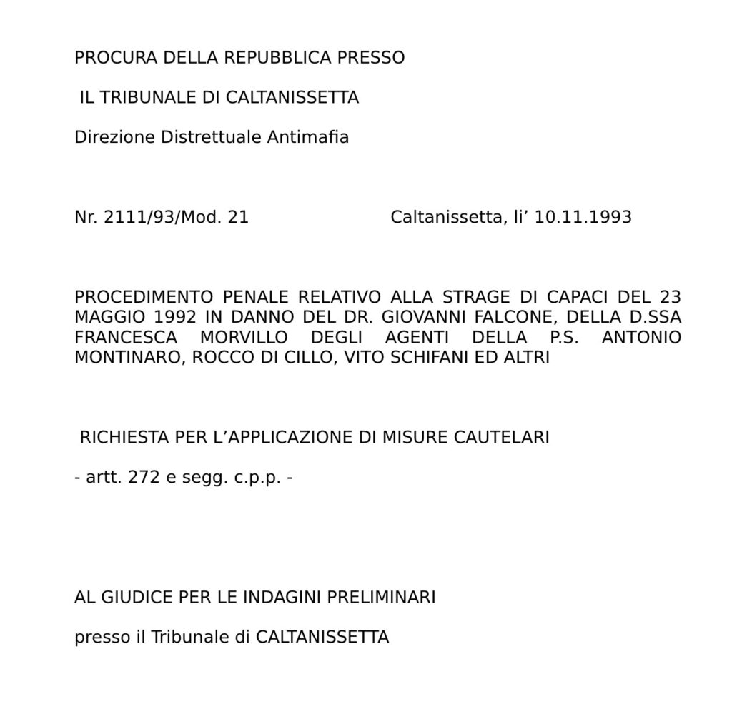 … Tutti gli elementi finora acquisiti dimostrano, senza possibilita’ di smentita, che a deliberare ed attuare l’eliminazione fisica del Giudice FALCONE – con modalita’ e luoghi dell’evento di cui si dira’ in seguito – e’ stata l’organizzazione mafiosa denominata “Cosa Nostra” di cui la Suprema Corte di Cassazione (con sentenza nr. 80/92 del 30.01.92 le cui motivazioni s’intendono qui interamente riportate) ha definitivamente sancito – al termine dell’iter processuale del c.d. maxiprocesso di Palermo – l’esistenza, la struttura unitaria e verticistica, le regole comportamentali degli adepti e l’elevata potenzialita’ criminale ( cfr. Faldoni 26, 26/A e 26/B per sentenza di I grado – Faldoni 26/C e 26/D per sentenza di III grado). Giova fin da ora premettere che la presente richiesta prendera’ in esame, quasi esclusivamente, le posizioni di coloro che sono stati individuati come facenti parte del commando operativo che ha organizzato ed eseguito la strage…