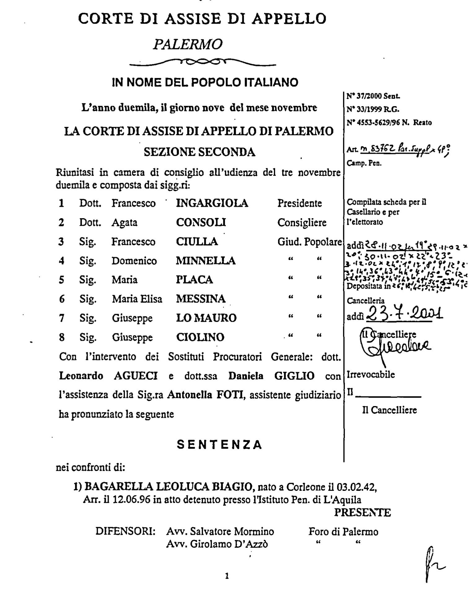SENTENZA APPELLO “BAGARELLA+59”