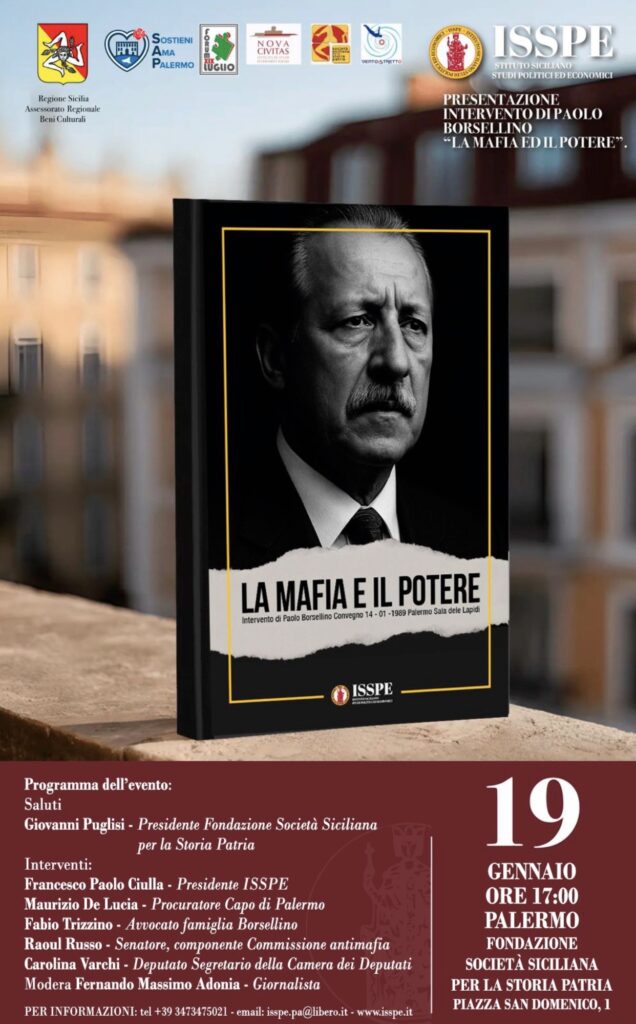 Lunedì 19 gennaio alle ore 17:00, in occasione dell’anniversariodella nascita di Paolo Borsellino, la presentazione del volume “La mafia e ilpotere” edito dall’ISSPE, alla Fondazione Società Siciliana per la StoriaPatria. La pubblicazione, autorizzata dalla famiglia Borsellino, contiene anche la riproduzione del dattiloscritto originale redatto dal magistrato.
