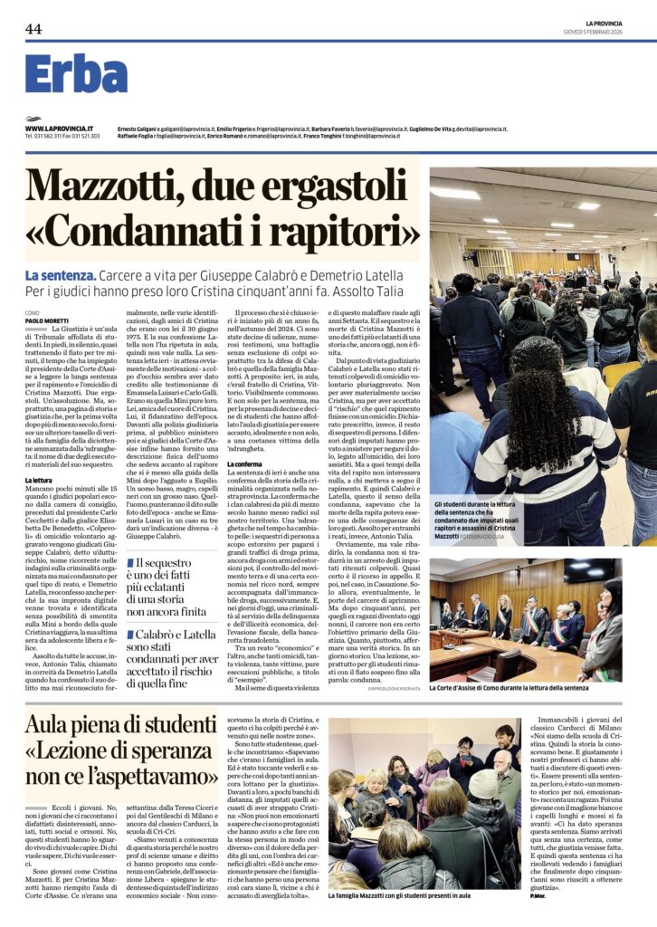 In aula in tribunale a Como erano presenti Vittorio, il fratello di Cristinae i suoi figli, Arianna e Jonathan, nipoti della 18enne rapita e uccisa. Non c’era invece la sorella Marina, che ha testimoniato durante il lungo processo, iniziato nel mese di settembre del 2024. Commossi, non hanno rilasciato dichiarazioni dopo la lettura della sentenza, ma tramite i legali hanno espresso la loro soddisfazione e la gratitudine per «una bella pagina di giustizia». In aula hanno ringraziato anche gli studenti presenti con l’Associazione Libera, una settantina di ragazzi del liceo classico Carducci di Milano, frequentato da Cristina, e dei licei Volta e Ciceri di Como. «La sentenza della Corte di Assise di Como è una pagina di grande dignità della giurisdizione. Rende omaggio alla memoria di Cristina Mazzotti e al dolore dei congiunti. E finalmente segna il crollo dell’impunità di Demetrio Latella e soprattutto di Giuseppe Calabrò, capo indiscusso della ‘ndrangheta in Lombardia». È il commento dell’avvocato Fabio Repici, avvocato di parte civile, dal cui impulso sono ripartite le indagini. Mazzotti fu la prima donna vittima dei sequestri di ‘ndrangheta che insanguinarono la Lombardia a partire dagli anni Settanta.