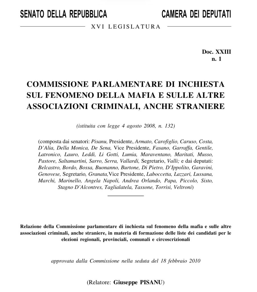 Relazione della Commissione parlamentare di inchiesta sul fenomeno della mafia e sulle altre associazioni criminali, anche straniere, in materia di formazione delle liste dei candidati per le elezioni regionali, provinciali, comunali e circoscrizionali (Relatore: sen. Giuseppe Pisanu), trasmessa il 18 febbraio 2010