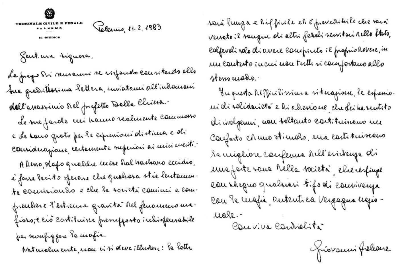 Il dottor Falcone risponde alla lettera della signora Geraldina Piazza, nipote del giudice Cesare Terranova assassinato da Cosa nostra il 25 settembre 1979.