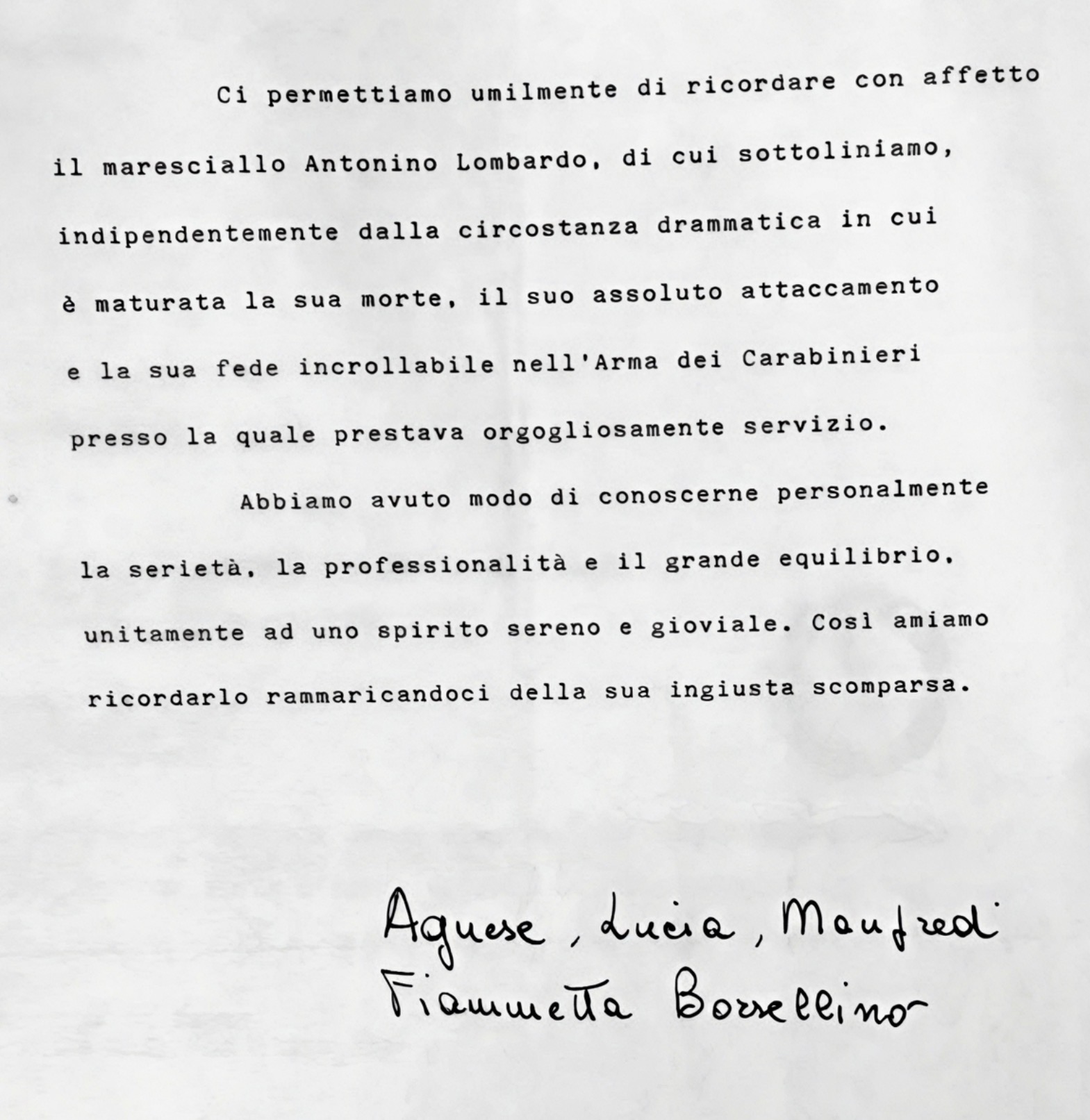 “Ci permettiamo umilmente di ricordare con affetto il maresciallo Antonino Lombardo, di cui sottolineiamo , indipendentemente dalla circostanza drammatica in cui è maturata la sua morte, il suo assoluto attaccamento e la sua fede incrollabile nell’Arma dei Carabinieri presso la quale prestava orgogliosamente servizio.Abbiamo avuto modo di conoscerne personalmente la serietà, la professionalità e il grande equilibrio, unitamente ad uno spirito sereno e gioviale. Così amiamo ricordarlo rammaricandoci della sua ingiusta scomparsa.