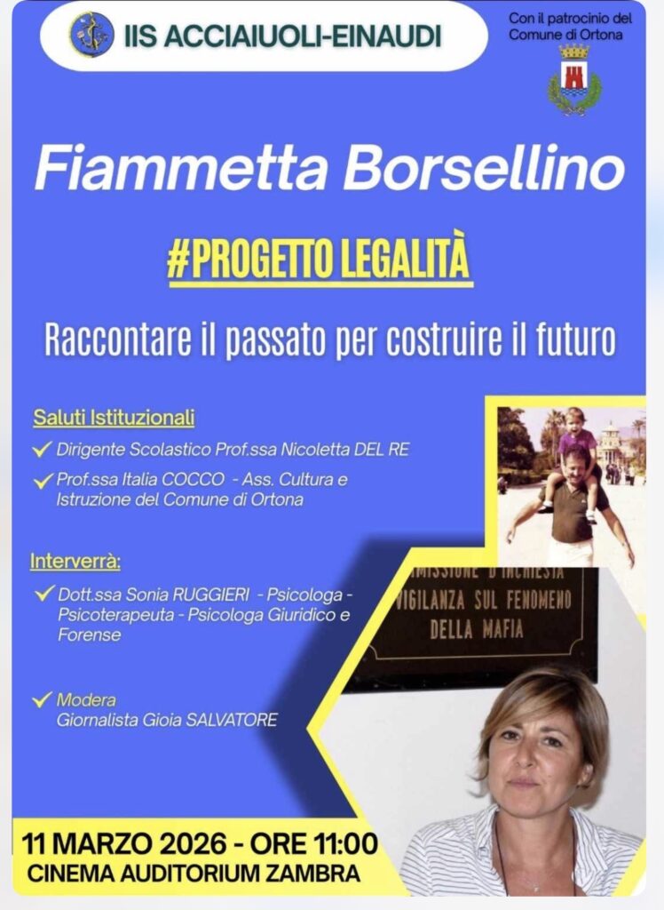 IIS Leone Acciaiuoli – Einaudi, Fiammetta Borsellino #progettolegalità raccontare il passato per costruire il futuro Mercoledì 11 marzo 2026 nell’Auditorium Zambra ad Ortona Fiammetta Borsellino al convegno organizzato dall’IIS Acciaiuoli Einaudi dal titolo “Raccontare il passato per costruire il futuro” Seconda parte Per guardare 📹 la prima parte dell’evento, clicca qui ➡