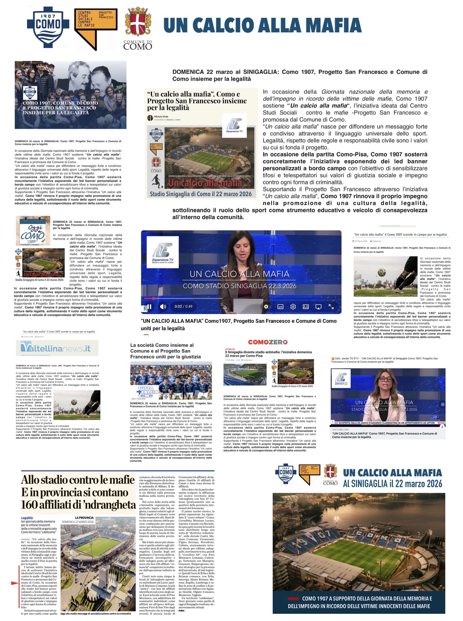 In occasione della partita Como-Pisa, in programma domenica 22 marzo 2026 allo stadio Sinigaglia, Calcio Como 1907, Comune di Como e Progetto San Francesco lanceranno un’iniziativa dedicata alla promozione della legalità.