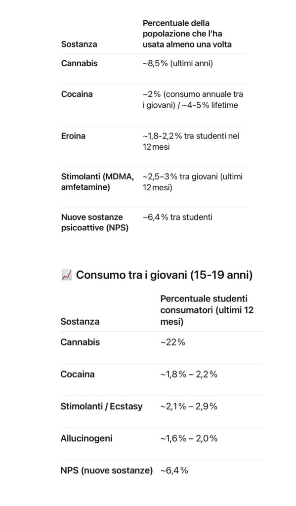 - Il consumo “almeno una volta nella vita” è molto più alto di quello recente (ultimi 12 mesi o ultimi 30 giorni): indica che molte persone provano una sostanza almeno una volta ma non necessariamente la usano regolarmente