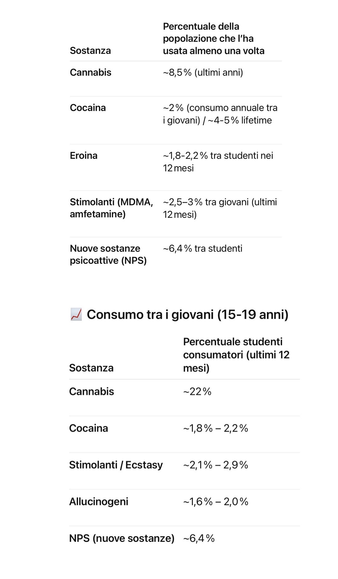 - Cocaina ha una prevalenza sensibilmente più bassa rispetto alla cannabis, ma è comunque significativa soprattutto in contesti urbani e sociali specifici.