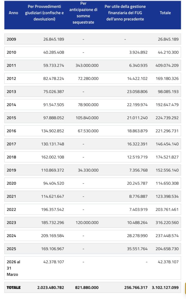 Secondo quanto riportato dalla Corte dei Conti nella Relazione sul rendiconto generale dello Stato per il 2009, al 31 dicembre 2009 risultavano confluiti nel Fondo unico giustizia oltre 1.592 milioni di euro, di cui 613,4 disponibili per la riassegnazione. A metà risultavano essere affluite al Fondo risorse pari a 2.049,3 milioni di euro.