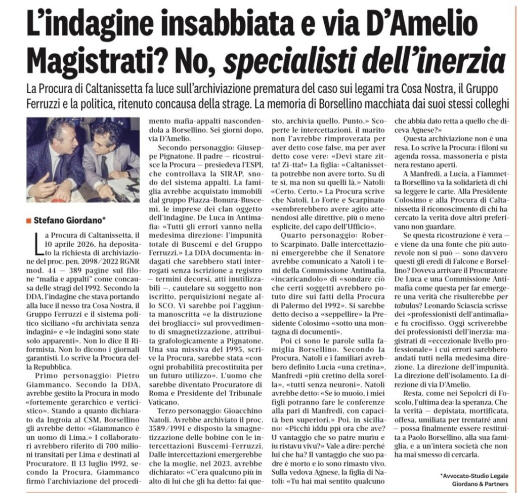 Ci sono dei buchi nella stagioni delle Stragi. Delle voragini. E in questo fossato si annidano anche veleni e divisioni. Anche se la veritร  รจ materia collettiva, bene comune. Anzi bene supremo. Lโ€™eccidio di Paolo Borsellinoรจ al centro di molti filoni dโ€™inchiesta. E quella su mafia-appalti: il dossier che in concomitanza di tangentopoliavrebbe permesso di scardinare un modo di fare politica in Italia. Una politica di connivenze, compromessi e zone grigie. La procura di Caltanissetta ha chiesto al gip di archiviare le indagini che collegano via Dโ€™Amelioallโ€™inchiesta delicata del Ros. E quelle carte sono finite nelle mani dei familiari del giudice. ยซHo cominciato a leggere la richiesta di archiviazione. Al di lร  degli apprezzamenti vergognosi in essa contenuti verso i figli del giudice Borsellino e captati nel corso delle intercettazioni, vorrei rassicurare tutti che a muovere la famiglia รจ solo il diritto sacrosanto di conoscere la veritร . Ci tengo a dire perรฒ una cosa: chi pensa di commemorare i morti del 1992 facendo finta che ieri non รจ successo nulla, dovrร  rispondere alla propria coscienzaยป, il commento sui social รจ dellโ€™avvocato Fabio Trizzino, marito di Lucia Borsellino, anche legale dei figli del giudice ammazzato dalle bombe del 19 luglio 1992.