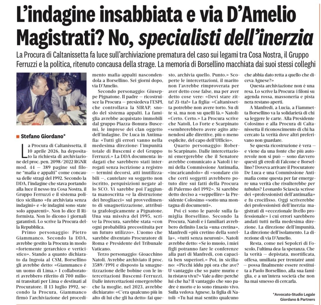 รˆ lo scenario su cui continuano ad indagare i magistrati di Caltanissetta: ยซ๐˜“๐˜ข ๐˜ด๐˜ฑ๐˜ข๐˜ณ๐˜ช๐˜ป๐˜ช๐˜ฐ๐˜ฏ๐˜ฆ ๐˜ฅ๐˜ฆ๐˜ญ๐˜ญ’๐˜ข๐˜จ๐˜ฆ๐˜ฏ๐˜ฅ๐˜ข ๐˜ณ๐˜ฐ๐˜ด๐˜ด๐˜ข ๐˜ฏ๐˜ฐ๐˜ฏ ๐˜ณ๐˜ช๐˜ด๐˜ฑ๐˜ฐ๐˜ฏ๐˜ฅ๐˜ฆ๐˜ท๐˜ข ๐˜ข๐˜ฅ ๐˜ข๐˜ญ๐˜ค๐˜ถ๐˜ฏ ๐˜ช๐˜ฏ๐˜ต๐˜ฆ๐˜ณ๐˜ฆ๐˜ด๐˜ด๐˜ฆ ๐˜ฅ๐˜ช๐˜ณ๐˜ฆ๐˜ต๐˜ต๐˜ฐ ๐˜ฅ๐˜ช ๐˜Š๐˜ฐ๐˜ด๐˜ข ๐˜ฏ๐˜ฐ๐˜ด๐˜ต๐˜ณ๐˜ข – scrivono anche questo i magistrati nel loro provvedimento di archiviazione – ๐˜ฒ๐˜ถ๐˜ข๐˜ฏ๐˜ต๐˜ฐ ๐˜ฑ๐˜ช๐˜ถ๐˜ต๐˜ต๐˜ฐ๐˜ด๐˜ต๐˜ฐ ๐˜ฅ๐˜ช ๐˜ข๐˜ฎ๐˜ฃ๐˜ช๐˜ฆ๐˜ฏ๐˜ต๐˜ช ๐˜ค๐˜ฉ๐˜ฆ ๐˜ค๐˜ฐ๐˜ฏ ๐˜ญ๐˜ข ๐˜ด๐˜ต๐˜ฆ๐˜ด๐˜ด๐˜ข ๐˜ฆ๐˜ณ๐˜ข๐˜ฏ๐˜ฐ ๐˜ช๐˜ฏ ๐˜ค๐˜ฐ๐˜ฏ๐˜ต๐˜ข๐˜ต๐˜ต๐˜ฐ ๐˜ข ๐˜ต๐˜ฆ๐˜ฏ๐˜ฆ๐˜ณ๐˜ฆ ๐˜ค๐˜ฆ๐˜ญ๐˜ข๐˜ต๐˜ฐ ๐˜ฒ๐˜ถ๐˜ข๐˜ฏ๐˜ต๐˜ฐ ๐˜‰๐˜ฐ๐˜ณ๐˜ด๐˜ฆ๐˜ญ๐˜ญ๐˜ช๐˜ฏ๐˜ฐ ๐˜ข๐˜ท๐˜ฆ๐˜ท๐˜ข ๐˜ด๐˜ค๐˜ฐ๐˜ฑ๐˜ฆ๐˜ณ๐˜ต๐˜ฐ ๐˜ด๐˜ถ๐˜ญ ๐˜ฑ๐˜ถ๐˜ฏ๐˜ต๐˜ฐ, ๐˜ฆ ๐˜ท๐˜ฆ๐˜ณ๐˜ฐ๐˜ด๐˜ช๐˜ฎ๐˜ช๐˜ญ๐˜ฎ๐˜ฆ๐˜ฏ๐˜ต๐˜ฆ, ๐˜ข๐˜ฏ๐˜ฏ๐˜ฐ๐˜ต๐˜ข๐˜ต๐˜ฐ ๐˜ฏ๐˜ฆ๐˜ญ๐˜ญ’๐˜ข๐˜จ๐˜ฆ๐˜ฏ๐˜ฅ๐˜ขยป.